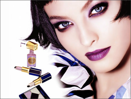 印象鲜明的眼妆,如果眉毛也画得很浓的话,整体感觉就太强烈了。所以眉毛应选择灰色,用眉粉补到眉毛间,淡淡描化。干眼睑处的紫色能令眼部整体印象鲜明起来,但如果涂得太浓的话,会显得脸色黯淡,所以在睫毛根部细而淡地画上些许紫色,下面的睫毛也涂上睫毛膏,不要忽略。