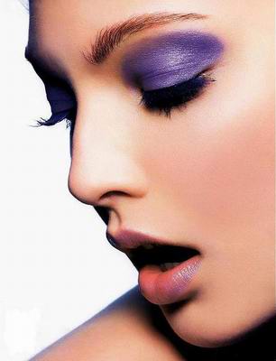 用眼影笔在眼睑的边缘画上眼影,晕开,直到双眼皮褶处。然后用眼线收敛边缘,涂上睫毛膏。这一妆容,亦适用于单眼皮的人,有显得眼睛大而有神的效果。眼部与唇部的色彩最好也统一为紫色。首先在整个眼窝涂上银色眼影,用浓一些的紫色包围上下眼睑。再用黑色眼线收敛,涂上足够睫毛膏。今年紫色化妆品种类非常丰富,而灵活地运用这些紫色正是创造魅力眼妆的关键。