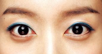 3.眼睛上下眼线使用不同颜色来表现出特别的效果。上面是用带亮色成分的灰色眼线笔画得粗一点,下面就用蓝色眼线笔上色进行点缀。要画得在眼角处相连的感觉。