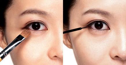 1.在眼睛双眼皮内,填满有放大眼睛效果的可可色眼影,剩下的眼影扫在下眼线下部,给眼睛打阴影。