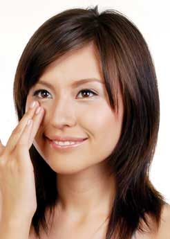 眼部皮肤很细嫩,如果眼霜使用不当,非但不能减少细纹,而且可能会加深。 先用右手无名指蘸取半粒米大小的眼霜,在右眼下方点一下,左手轻轻地将右眼的下眼皮往下拉一点,千万要轻。