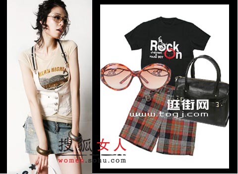 Rock风格的T恤+格纹五分裤