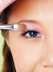 step3: 选深粉色涂在双眼皮皱褶处,然后用带有珠光效果的淡粉色眼影向上晕染涂抹;