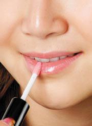 step4:使用无色护唇膏后在嘴唇上扑一层粉底有效淡化唇色,唇妆色彩更接近理想效果;