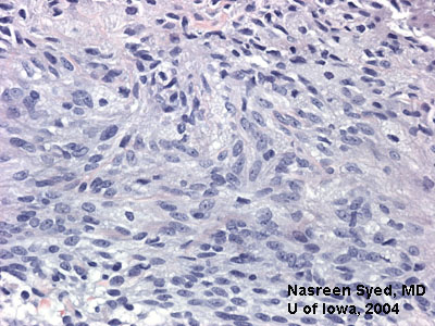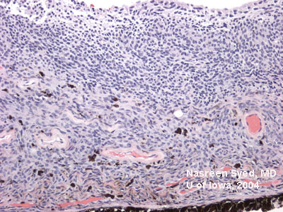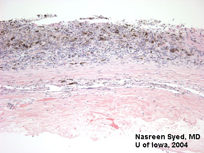 图6:虹膜黑色素瘤的病理图片低倍镜下被切除的含黑色素瘤的虹膜组织