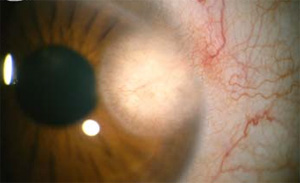 患者曾患过带状疱疹角膜炎,脂质的盘状沉积物出现在带状疱疹角膜炎的血管化疤痕处。