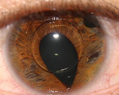 :有晶体眼的人工晶体眼在受到钝伤后,部分人工晶体的下襻嵌入了瞳孔边缘。