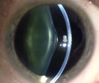 注释:晶状体皮质表面圆锥状突出,晶体前后囊膜、两极变薄,伴随高度近视。常发生于Alport’s综合征。可能伴随发生白内障