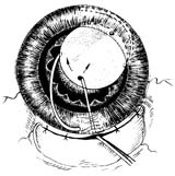在某些情况下,用调位钩将晶体上袢旋转到位,简单易行,可作为囊镊送入法的补充。即以调位钩插入调位孔,以推旋动作,使晶体作顺时针旋转,晶体上袢将在瞳孔张力限制下被压缩,其膝部一旦越过瞳孔缘,将自行弹向睫状沟