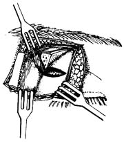 分离两侧骨膜,暴露骨壁,并自眶而将后部较薄弱的骨壁凿断,达眶下裂外侧角。