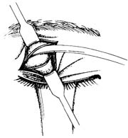 距眶上缘3mm,用剪刀沿眶缘剪开眶隔,即有眶脂肪脱出。切除脱出的脂肪即可暴露泪腺。