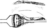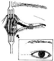 沿肌纤维分离眼轮匝肌,拉开肌肉,暴露眶外缘骨膜及外眦腱。切断外眦腱及外侧节制韧带,并沿眶缘向上下切开上下眶隔各15mm(2)。