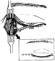 分层缝合,用4-0尼龙线缝合眶隔,将外眦腱缝于骨膜上。缝合眼轮匝肌。皮肤缝4~5针。用绷带轻轻包扎