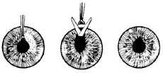 拉出切口,剪口朝向上直肌,剪除约1mm长的组织,送回其余的虹膜组织,上方虹膜有一半月形缺口。