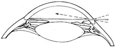 将前房角镜(以barkan前房角镜为侧)轻轻放于角膜上。镜子应偏向角膜鼻侧部分,以便前房角切开刀从暴露的颞侧角膜宽约2mm的半月形部分进入前房。术者左手示指可固定前房角镜。