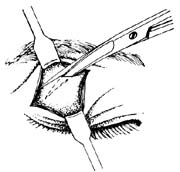 分离皮下组织、眼轮匝肌,直至看到眶隔。见到泪腺向前突于眶隔薄弱处后面。距离眶上缘5mm,平行于眶缘切开眶隔,切口长15mm。钝性分离后便有泪腺组织和眶脂肪脱出。剪去脱出的脂肪。