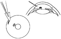 前房异物 位于异物经线位置作角膜全层切开,切口位于角膜缘内1mm,切口长度应大于异物直径约1mm。