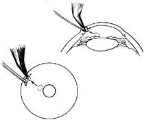 用手持电磁铁,电磁头由远而近接近切口,每向前移动一次电磁铁,开动一次电门,当电磁铁移至切口边缘,看见已吸引到切口处的异物时,助手用虹膜恢复器轻压切口后唇,异物即吸附在电磁头上。