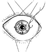 缝线开睑或使用无磁性的开睑器开睑。在异物所在经线的角膜缘用1%龙胆紫作一标记,在其对侧角膜缘作一定位缝线。如果异物在锯齿缘之前,可不作缝线。