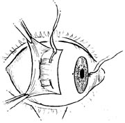 于预定取出异物之经线方向,距角膜缘约8mm处,作与角膜缘平行的球结膜切开,切口长约10~20mm,切开球筋膜,暴露巩膜。