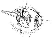 巩膜切口作予置缝线一条,切口两侧各作一排电凝。