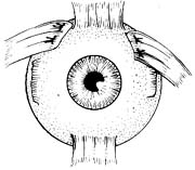 knapp的办法是,将内、外直肌的全部肌腱移位缝在近上直肌附着点的巩膜上(图5),也可同时后退下直肌。 |