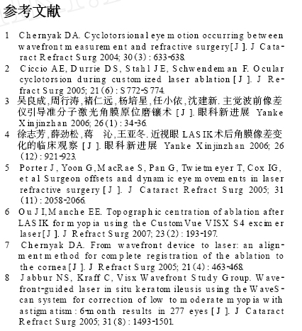 总之,通过应用CustomVueTM 进行术中虹膜定位,我们发现角膜屈光手术中会发生一定的眼球旋转和瞳孔中心移位, CustomVueTM可以进行有效的测量和调整。