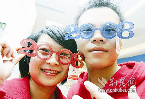 在汉口武汉国际广场内,两名年轻人正在试戴几款“2008奥运眼镜”,艳丽的色彩,别致的造型,顿时引来了不少顾客好奇的目光。据了解,这种眼镜是首批进入武汉市场的奥运特许商品之一,随着2008年的临近,奥运氛围日益浓厚,这类奥运特许商品引来越来越多的消费者关注。