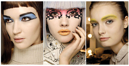 Ⅰ 透亮感多彩妆容 本季的妆感已经不是缤纷多彩就足够了,除了鲜艳抢眼的色彩,还得要透出纯净光亮才够看。乍看之下有点突兀的缤纷眼线搭配鲜艳饱满的唇,已经算是最基本消费!几乎晕染到眉峰的多色眼影,甚至将彩色眼影直接上在眉毛,都不算设计师玩太HIGH的例子!总之就是极尽可能的玩弄色彩,把握整体妆容柔和但干净鲜明的原则就错不了!