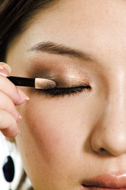 3.在上眼睑的位置增加颜色渐层 沾取D眼影从2/3处开始涂刷至眼尾,涂刷时尽量不要超出在眼折外。