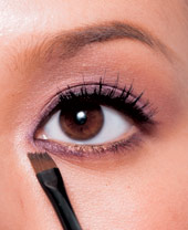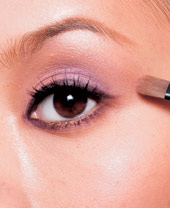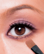 6. 最后利用眼影刷上的紫色余粉,沿着上眼线尾端部分顺势往上拉,增加眼神柔媚感。