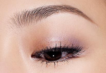 1、 在眼部以肤色修正液打底后,选用浅棕色眼影涂抹整个眼窝。 2、 在眼尾选用浅紫色眼影加重涂抹,突显眼部的妩媚感。 3、 玫瑰色腮红从鼻梁两侧向太阳穴方向晕开,制造羞涩感。 4、 将浅金色唇膏和粉色调唇彩混合涂抹在唇上,让唇色与整体眼妆相呼应。