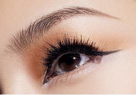1、 在眼睑处大面积涂抹金色眼影,内眼角抹些银粉。 2、 重点强调眼线,用黑色眼线液拉长眼尾部分并上扬,让双眼更细长。 3、 使用黑色睫毛膏,反复涂刷睫毛,达到羽翼般丰满的效果。 4、 在下眼睑的外眼角处用亮白色眼影提亮。