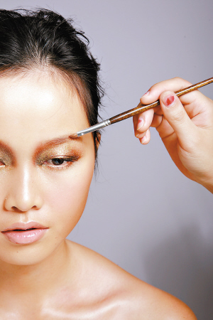 在眼球部位涂上金色粉状眼影,使整个眼睛看起来更加立体,记得用黑色眼线笔加强睫毛根部。眉毛只要修剪自然即可,然后刷上咖啡色的眉粉加重颜色。