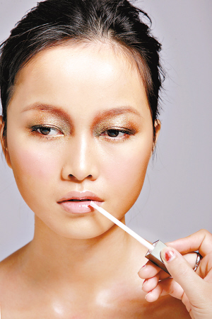唇部先用肉色唇膏薄薄涂一层,然后用肉粉色唇彩刷一遍即可。