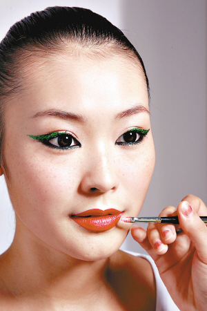 先用唇刷勾勒出唇形,再用正红色唇膏填满即可。正红的唇彩抛弃了传统红绿不搭的原则,创造出另外一种感觉。
