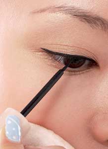 4.用粉扑固定,防止手抖。然后使用眼线液叠画一层在眼线上。