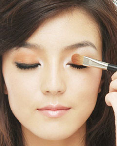 step1: 用橘色、金色眼影从内到外将眼窝涂满,营造深邃动人的效果。