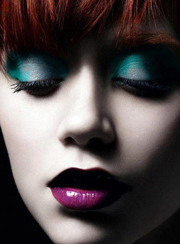 水蓝色眼影与紫红色唇色对比强烈,眼下正流行这种夸张的妆容,不如在圣诞夜party上秀一下!