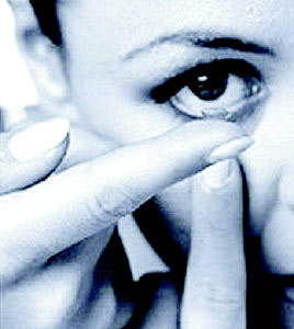 清洁双手后,将镜片放在食指指尖上,注意正面朝上(参见右图)双眼注视前方,双手中指将上下眼睑拉开,然后将镜片附着于角膜中,然后移开食指再往下看以使镜片附着于眼睛上,双手中指徐徐放松眼皮。