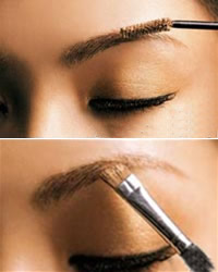 用棕色眉毛膏减淡眉色,使用完眉粉后,在眉毛上涂抹棕色眉毛膏(上图)。