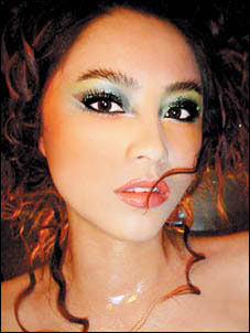 画眼影技巧:用墨绿、翠绿及黄绿过渡画出烟熏的效果,并在睫毛跟部用绿色的闪光口者喱制造华丽效果。并要注意用眼线强调模特的眼型。