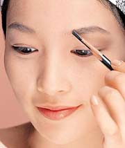 最后要提醒的是,两条相距很近的眉毛会给人一种心事重重的感觉。太浓的眉毛则会使脸的轮廓线条显得太硬朗。若两条眉毛太稀疏,又显得缺乏性格。不管眉毛形状如何,向上微挑线条,会让人显得更富活力。要找自己的标准眉形,可用笔杆由鼻翼连接眼角,找出以上3点连线成合适眉形。