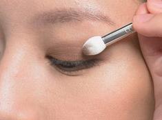 描绘时只用海绵头前端,将它立起来用前端一点点的面积来涂,才容易画得均匀。从距离眼头1/3位置的睫毛根部开始,先往后画、再从眼头画到此处。