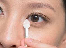 以海绵棒沾上卡其色眼影粉,抖落几下让粉均匀沾在眼影棒上,从眼球中央呈ㄑ字向上来回晕染,大约至2/3眼窝高度,重复涂刷让褐色的层次更分明。