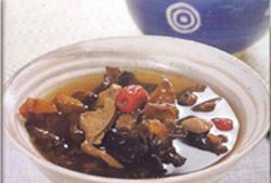 材料: 黑木耳五钱、猪肝六两、生姜一片、红枣两粒、盐少许 做法: (1)先将黑木耳用清水透发,洗干净,备用。 (2)猪肝、生姜、红枣分别用水洗干净。猪肝切片;生姜刮皮;红枣去核,备用。 (3)加入适量清水于煲内,先用猛火煲至水滚,然后放入黑木耳、生姜和红枣,继续用中火 煲一小时左右,加入猪肝,等猪肝熟透,便可加盐调味,饮用。 功效: (1)有补益血气,活血祛瘀的作用 。 (2)中医认为如果过度疲劳,夜眠不酣,就会容易出现肝失疏泄,脾运不力,气滞血瘀的症 状,眼睛周围会出现黑晕,经常适当饮用此汤,有助干预防以上的症状出现。 (3)如果妇女气滞血瘀,月经不调,经期腹痛,黑眼圈,脸上出现黄褐斑,都可以用此汤作食疗。 (4)此汤性质平和,男女老少皆适宜。 | 穴位按摩:黑眼圈是因为血液循环不佳而造成的,穴位按摩有助于打通血脉;在眼周皮肤上涂上眼部按摩霜或眼部营养霜。用无名指按压童子廖(在眼尾处)、球后(下眼眶中外1/3处)、四白(下眼眶中内1/3处)、睛明(内眦角内上方)、鱼腰(眉正中)、迎香(鼻翼外侧),每个穴位按压3--5秒后放松,连续做10次。用中指和无名指(中指放在上眼睑,无名指放在下眼睑)轻轻地由内眦向外眦轻拉按摩,连续10次。用食指、中指、无名指指尖轻弹眼周,3--5圈。