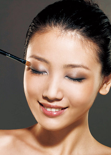 B 眼尾不要戛然而止 再用眼影粉从眼头部位向眼尾部位推匀,在眼皮处画浅色、眼窝处画深色,并且在眼尾处眼影不要戛然而止,最好有少许的向后延长,有一种加深加大眼部的感觉。