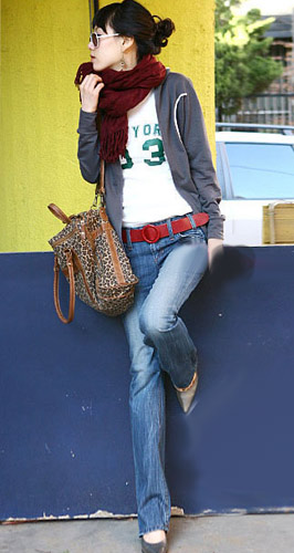 搭配Tips:连帽运动上衣与永不褪色的牛仔裤相配则时尚感呼之欲出,一幅别致的墨镜让你轻松拥有明星气质。红色的围巾打破了灰色的沉寂,增加了一道耀眼光芒。