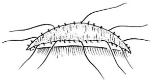 3.移植皮片 自上臂内侧或锁骨上窝取全厚或中厚皮片移植于创面上,缝合皮片[图1⑶]。