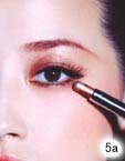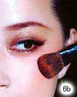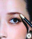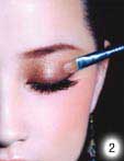 2.选定与肤色融合的浅棕色系珠光眼影,在眼褶皱处上色,并由眼皮的中间向眼尾、再由眼窝的方向刷向眼尾并刷匀,若涂抹太厚重,可以手指轻轻推散,这样会比较自然。颜色比较深的眼影是整个眼妆的重点部分,将可以与浅色系作搭配的深金棕色眼影棒先于手背上稍稍搽过,让上妆更加均匀,然后将其涂抹于上眼睑处呈半圆形,并用刷子由睫毛根部向眉骨呈放射状扫开。